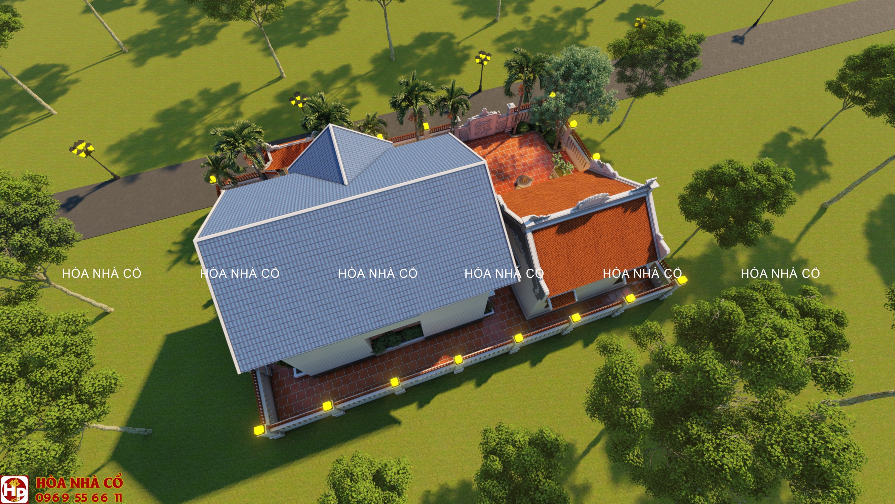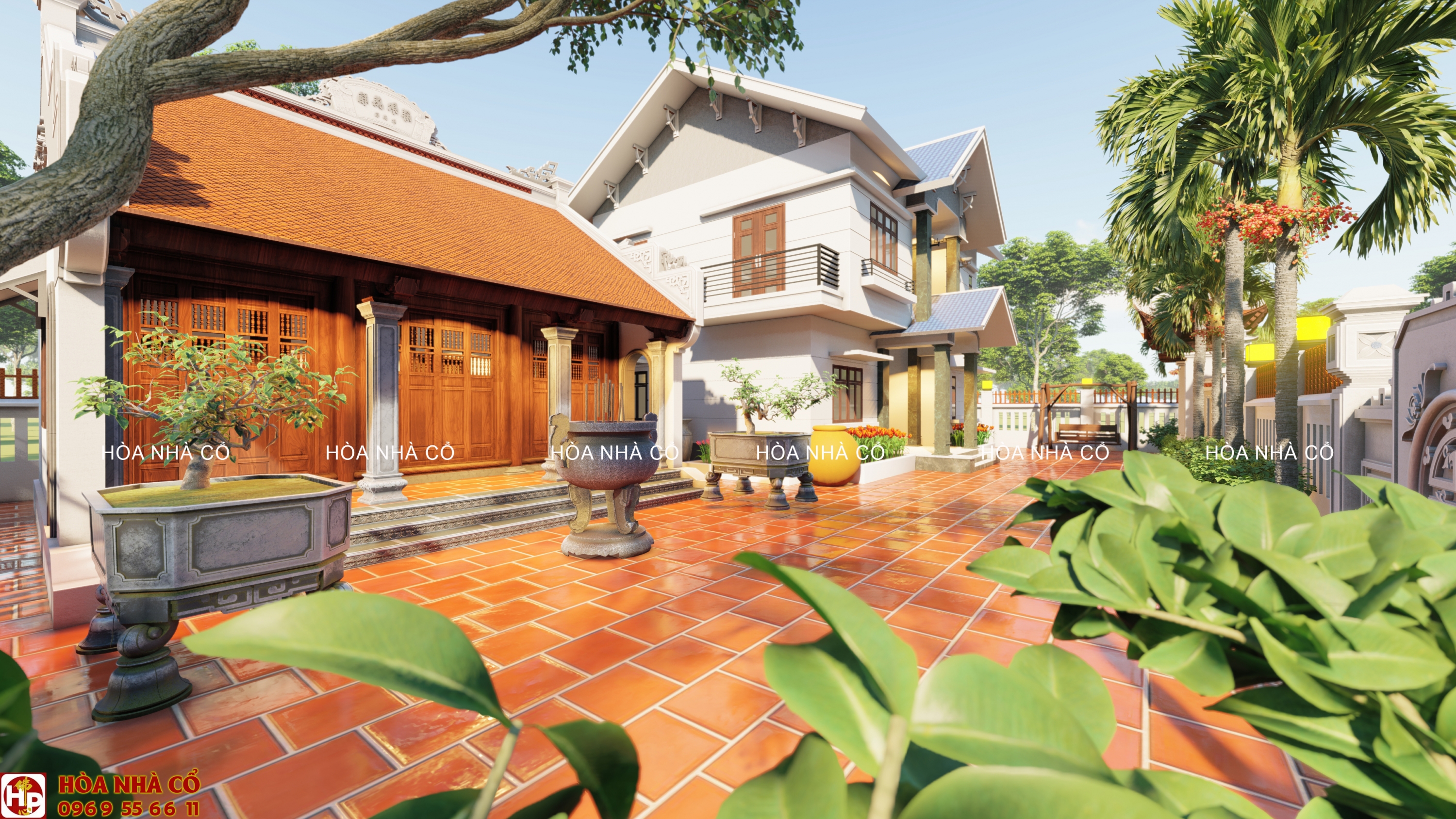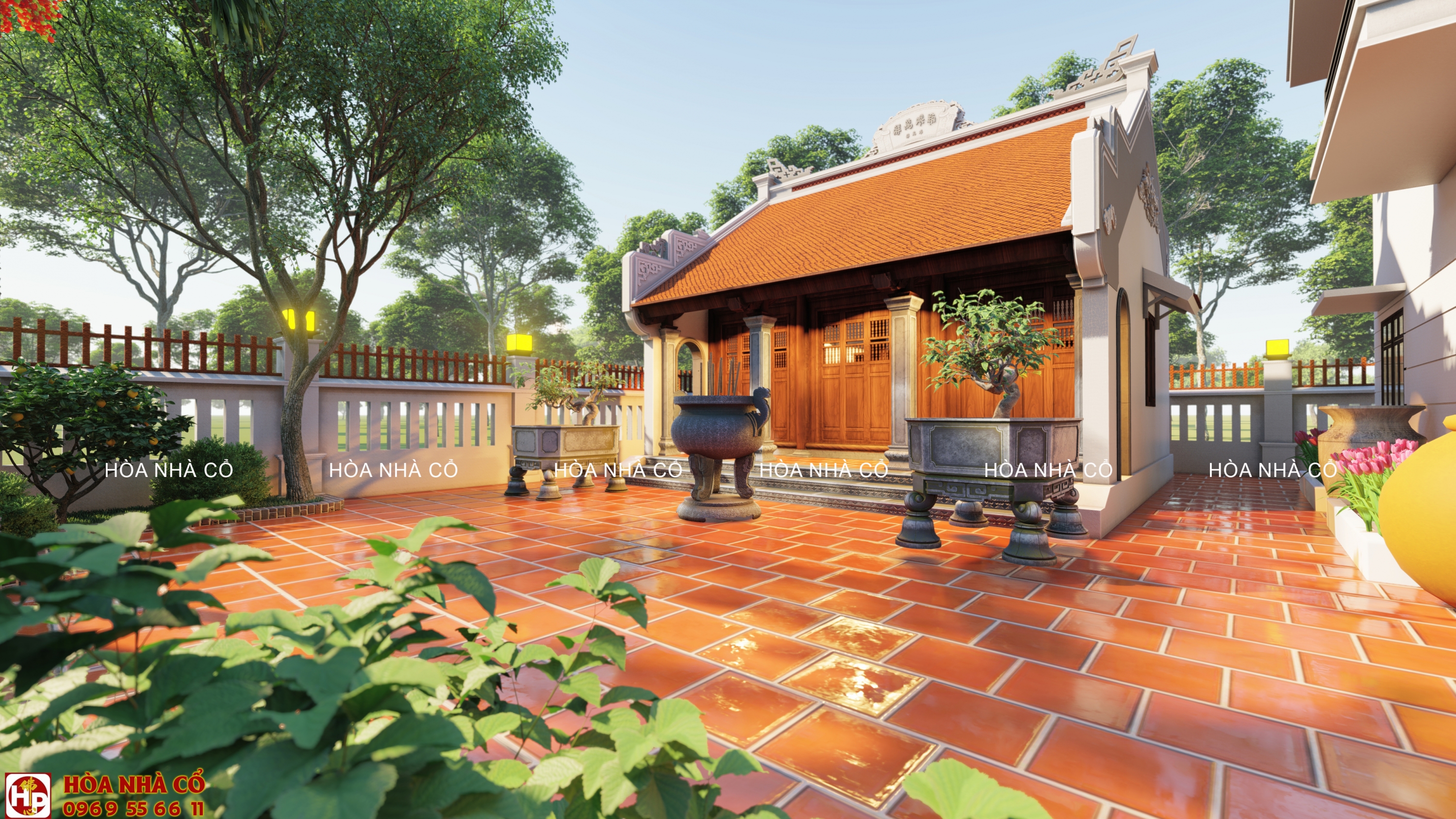 - Bao quanh nhà được thiết kế nhiều cây cối, tạo cảm giác thoáng mát. Bên cạnh đó còn được bố trí thêm lư hương được đặt trước sân . Điều này giúp cho không gian nhà thêm phần cổ kính.