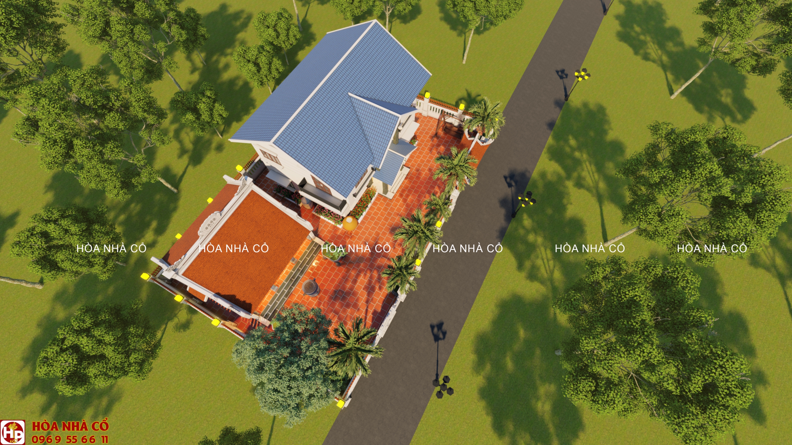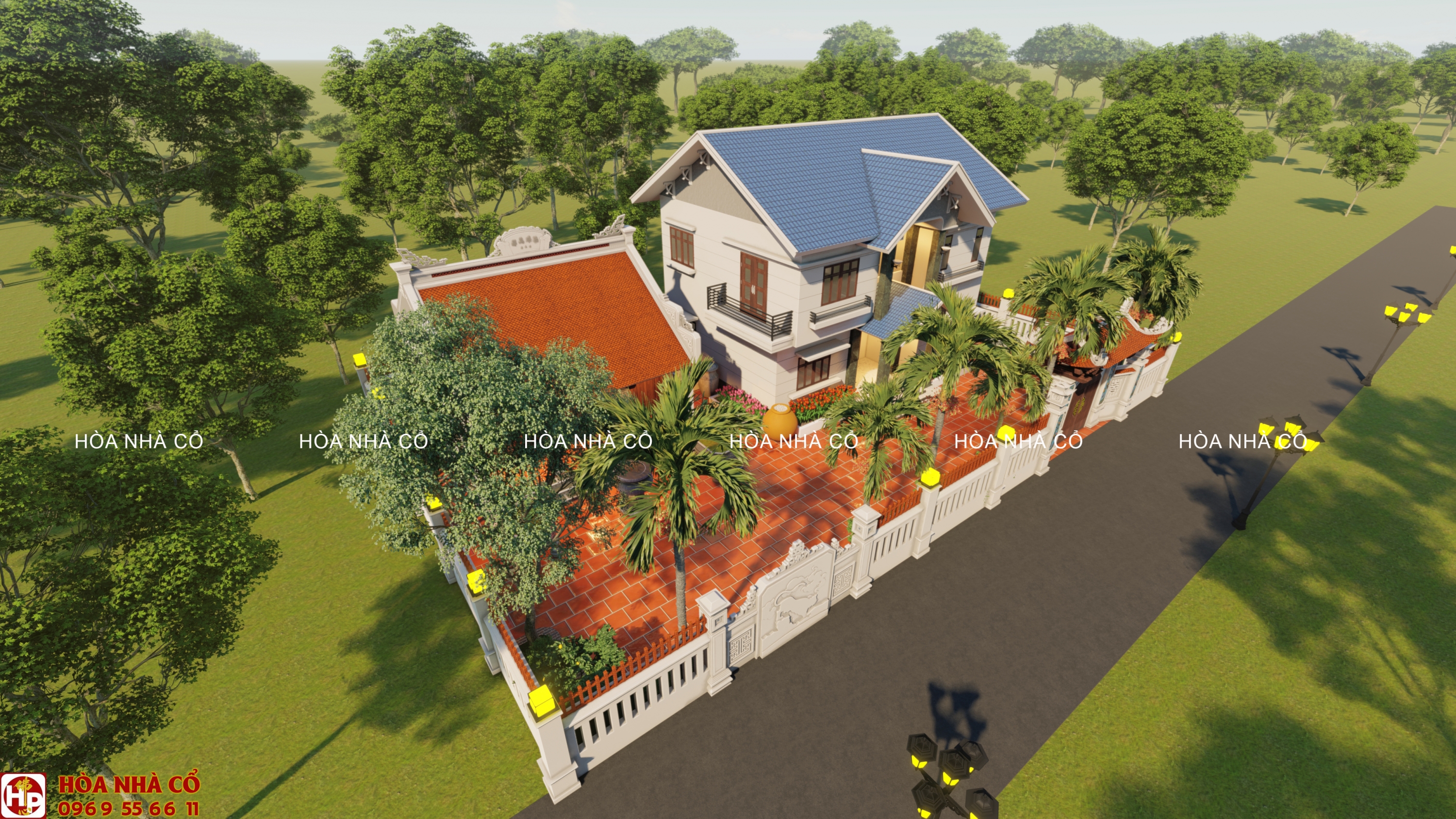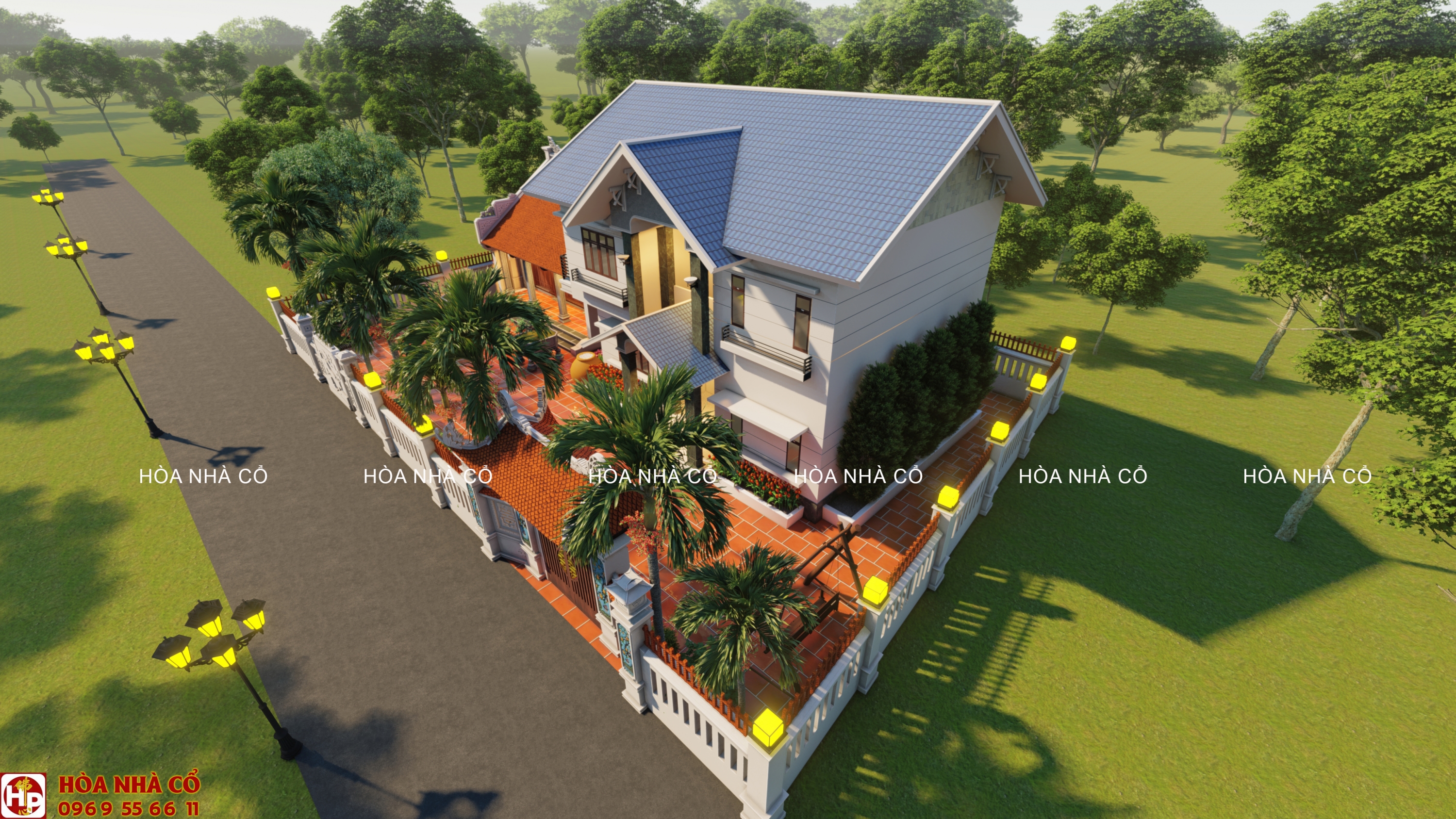 - Bao quanh nhà được thiết kế nhiều cây cối, tạo cảm giác thoáng mát. Bên cạnh đó còn được bố trí thêm lư hương được đặt trước sân . Điều này giúp cho không gian nhà thêm phần cổ kính.