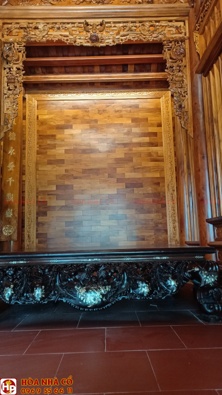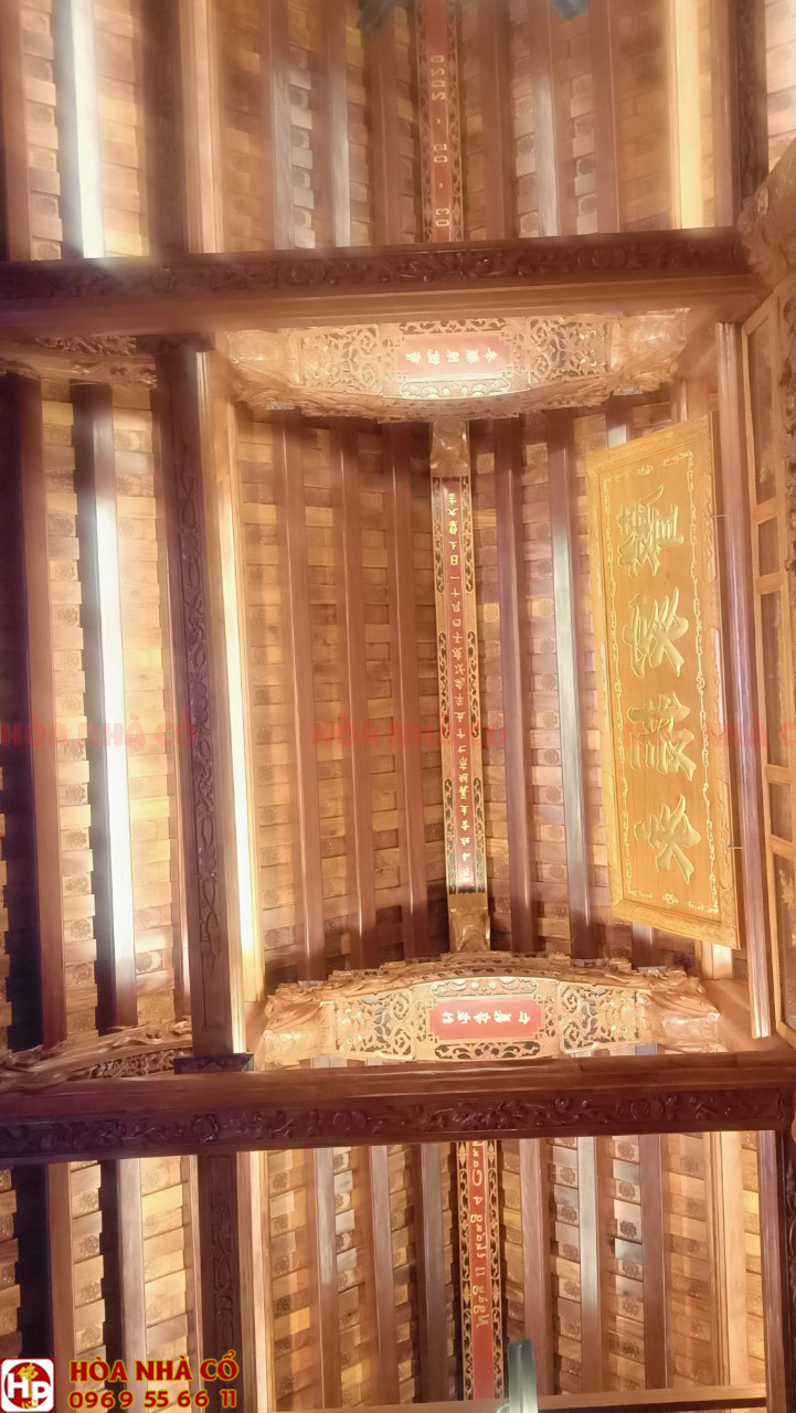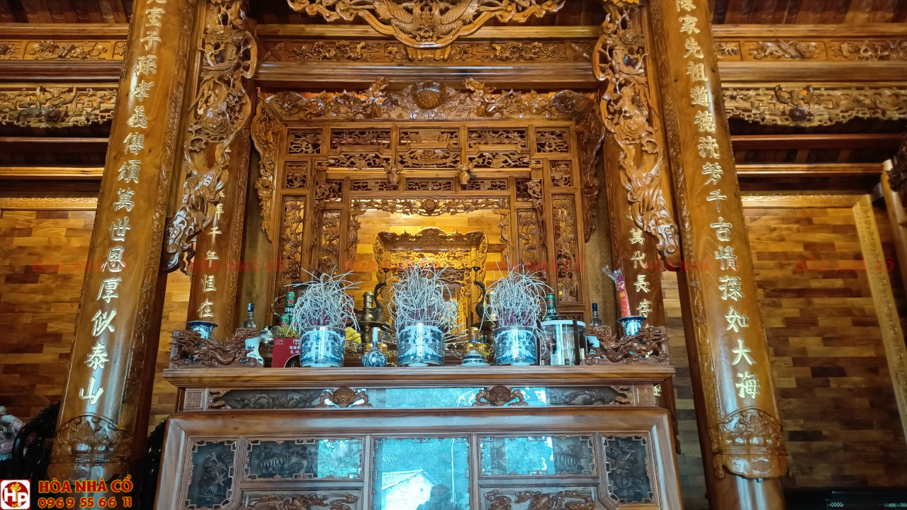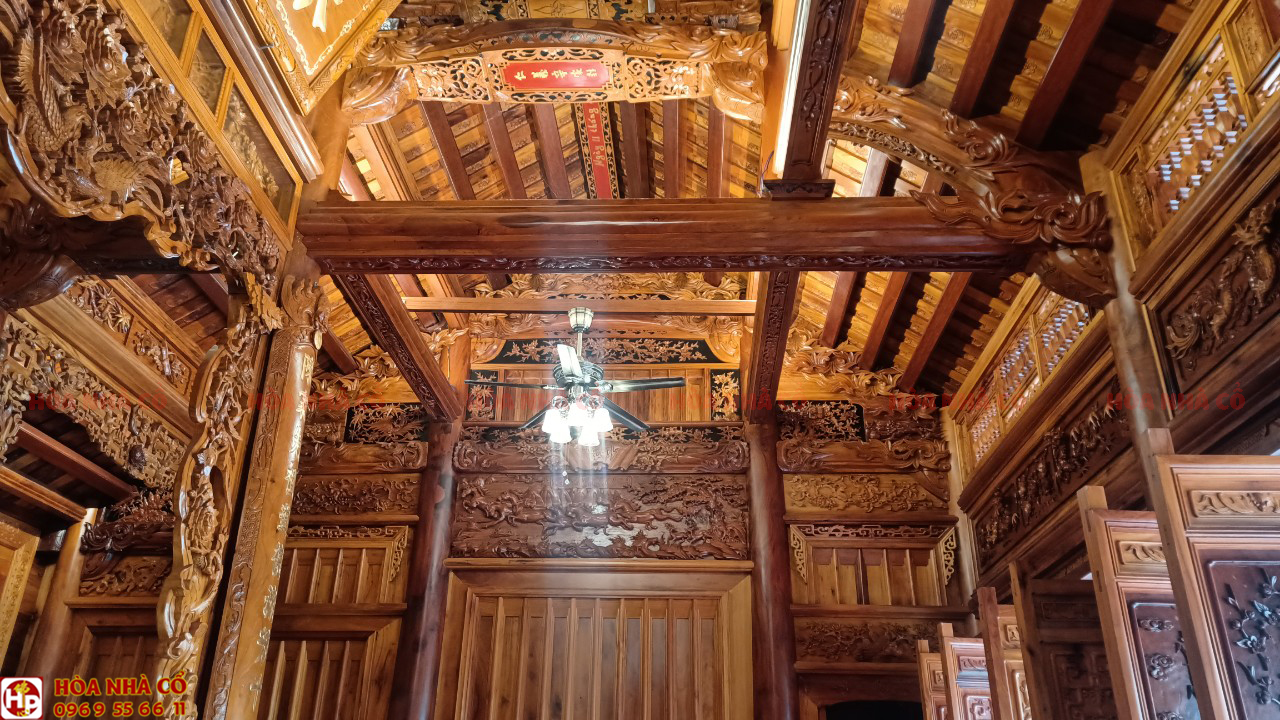 Bốn chín hàng cột lim già vài trăm năm tuổi cùng hàng trăm khối gỗ quý tạo thành hình hài ngôi nhà gỗ có một không hai. 60 cây vàng được giát vào hoành phi,...