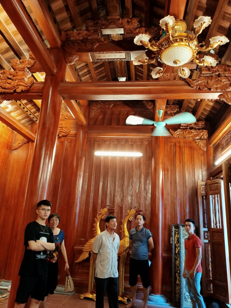 Toàn bộ ngôi nhà chỉ dùng một loại gỗ chò chỉ già tuổi, được thiết kế theo dạng cột trơn, hoành soi cạnh, hai bên chồng cánh, giữa là kẻ chuyền con cung… đúng kiểu nhà cổ. Tất cả từ cánh cửa, hoành đều trạm, đục hoa lá hay những Hán tự cổ. Ngay cả cái bậu cửa cũng được vuốt những đường rất kỳ công, phẳng lỳ, mát lạnh màu gỗ. Tính tổng lượng gỗ đã trên 70 mét khối gỗ rồi, công đục chạm là 650 triệu, nếu hoàn thiện, chưa kể nội thất cũng phải trên 4 tỉ”.