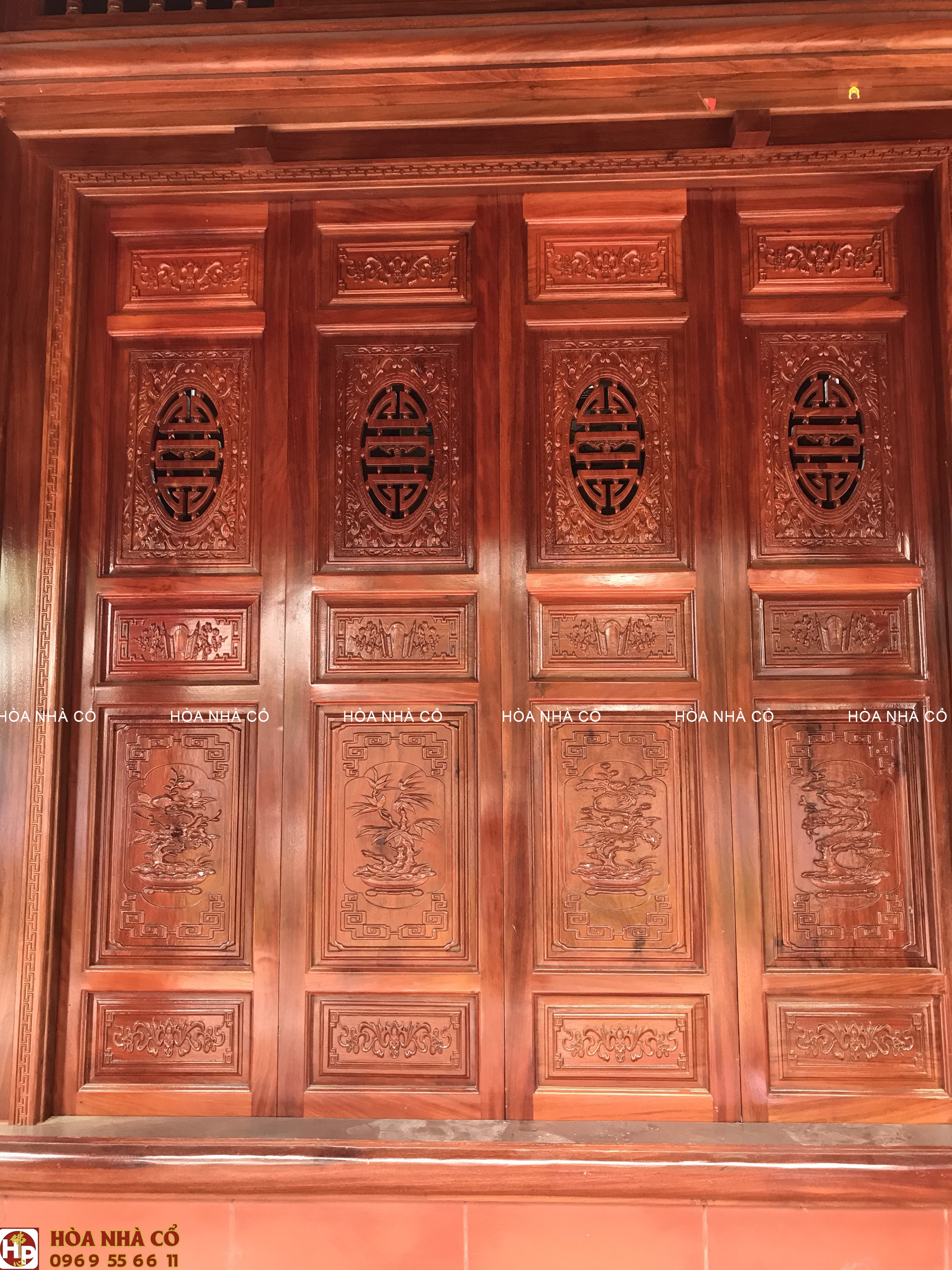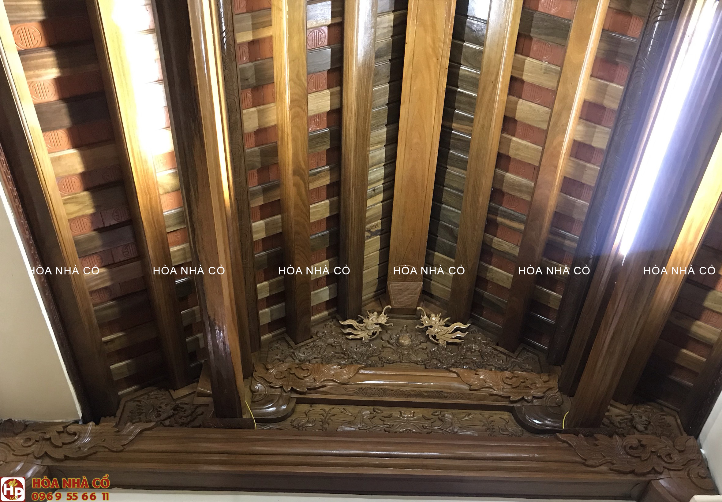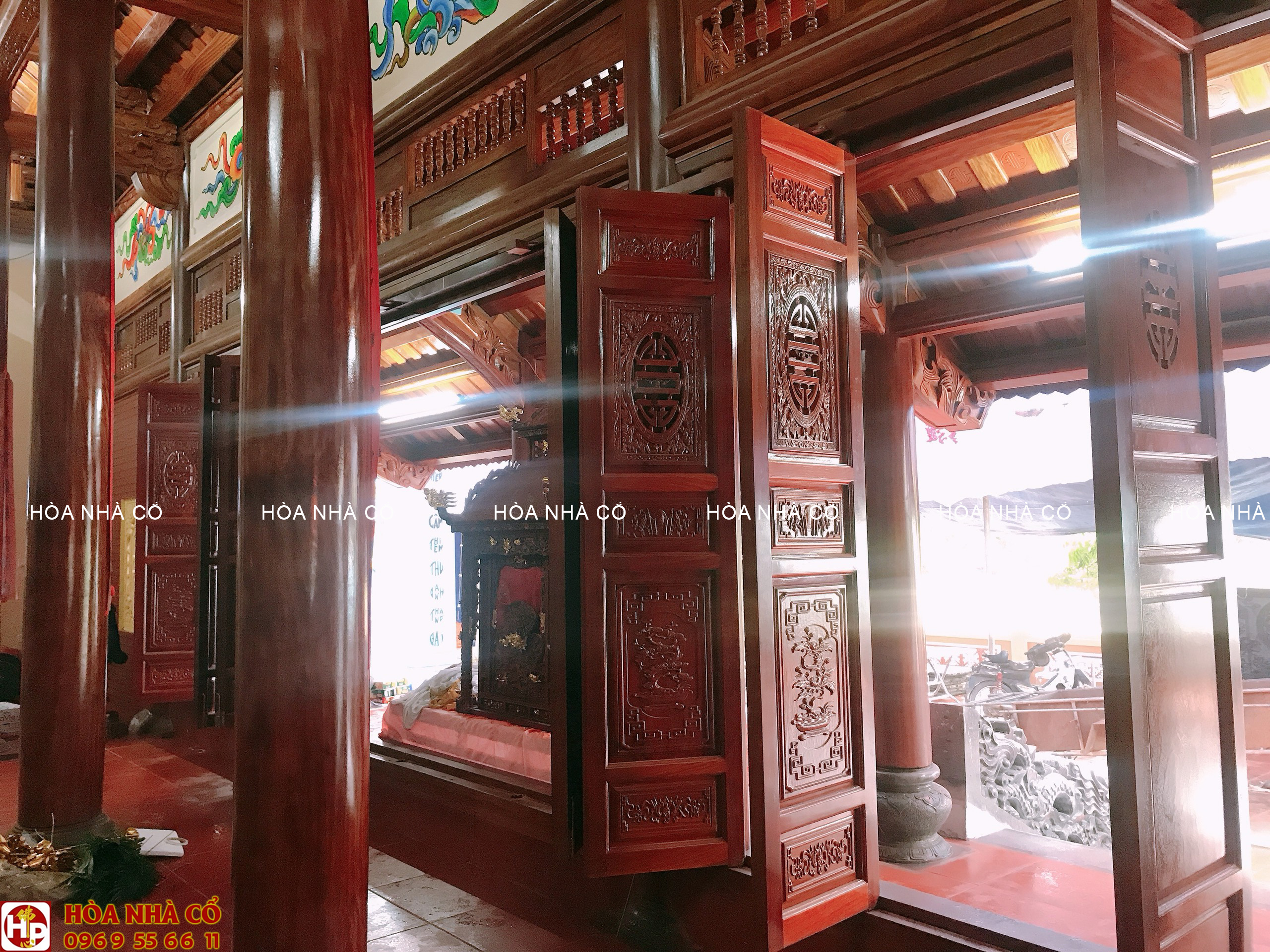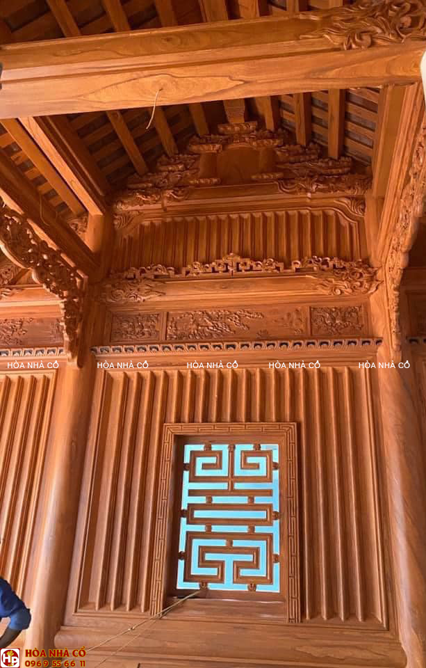 Bốn chín hàng cột lim già vài trăm năm tuổi cùng hàng trăm khối gỗ quý tạo thành hình hài ngôi nhà gỗ có một không hai. 60 cây vàng được giát vào hoành phi,...